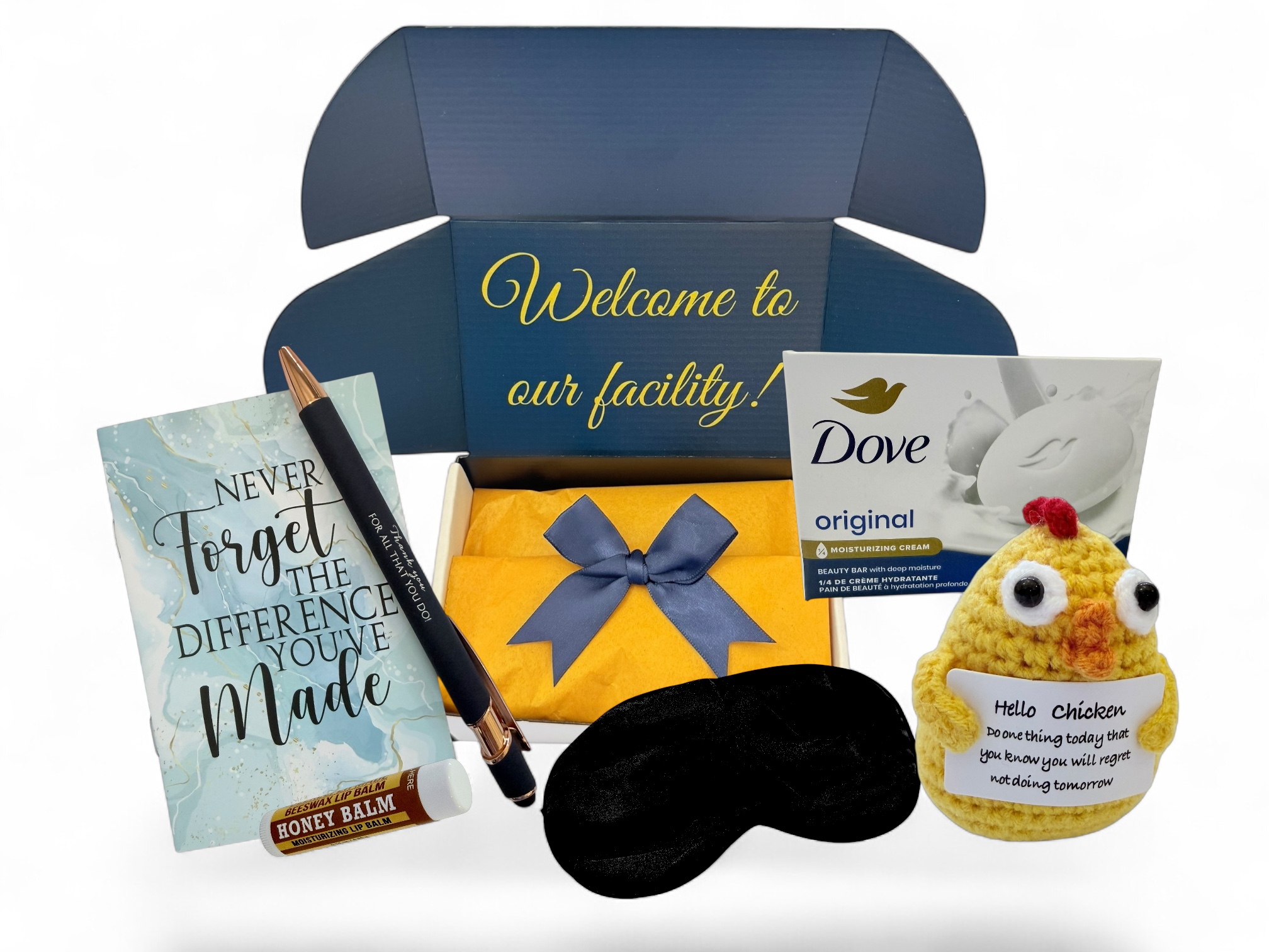All items come neatly packaged in a premium gift box with the message “Welcome to our facility!”, offering a warm introduction to your care community.
